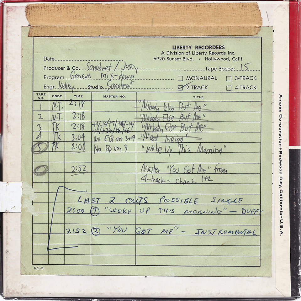 The Sonobeat archives don’t document the dates Sonobeat recorded Geneva’s tracks, but we’re able to loosely bracket the time frame during which the sessions occurred because the master tape box is labeled using a Liberty Recorders tracking sheet that Sonobeat didn’t have in its possession until January 1969. That was when the Joseys trekked to Liberty Records in Los Angeles to deliver the Johnny Winter album it had just sold to Liberty’s Imperial label. And it was then that they grabbed a stash of the tape box labels during a visit to Liberty’s Hollywood recording studios.