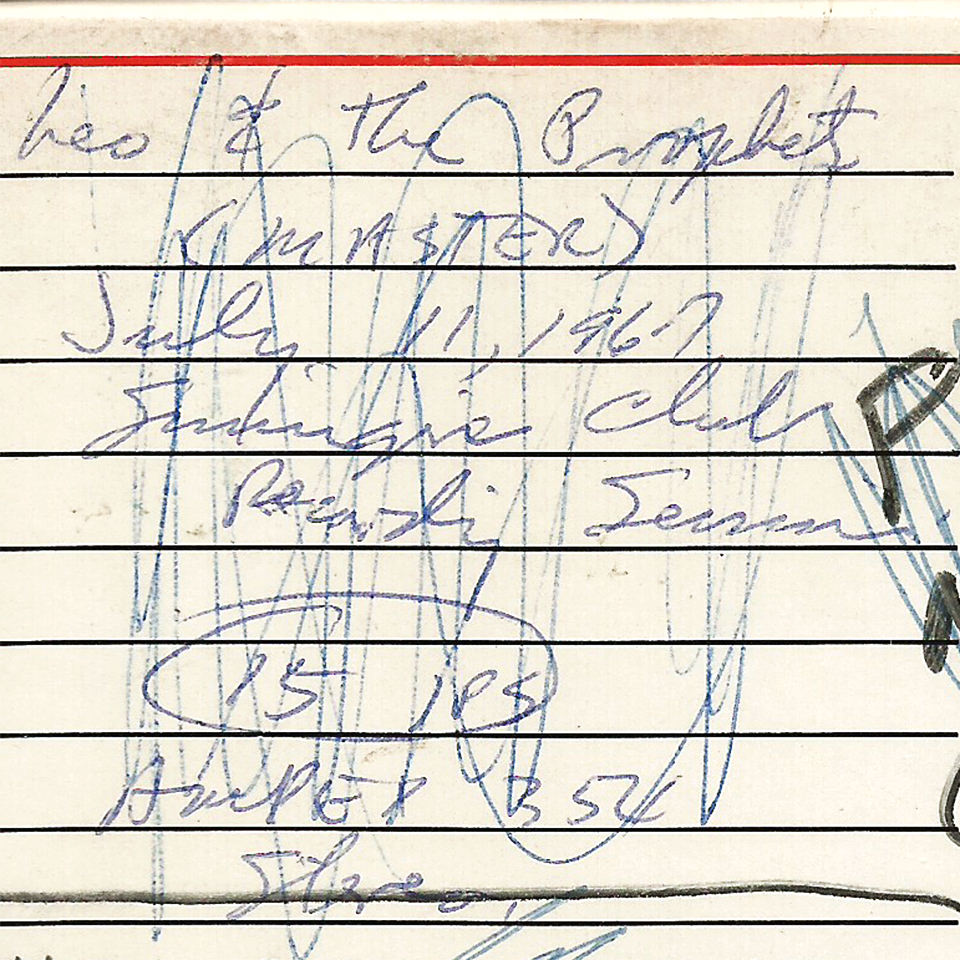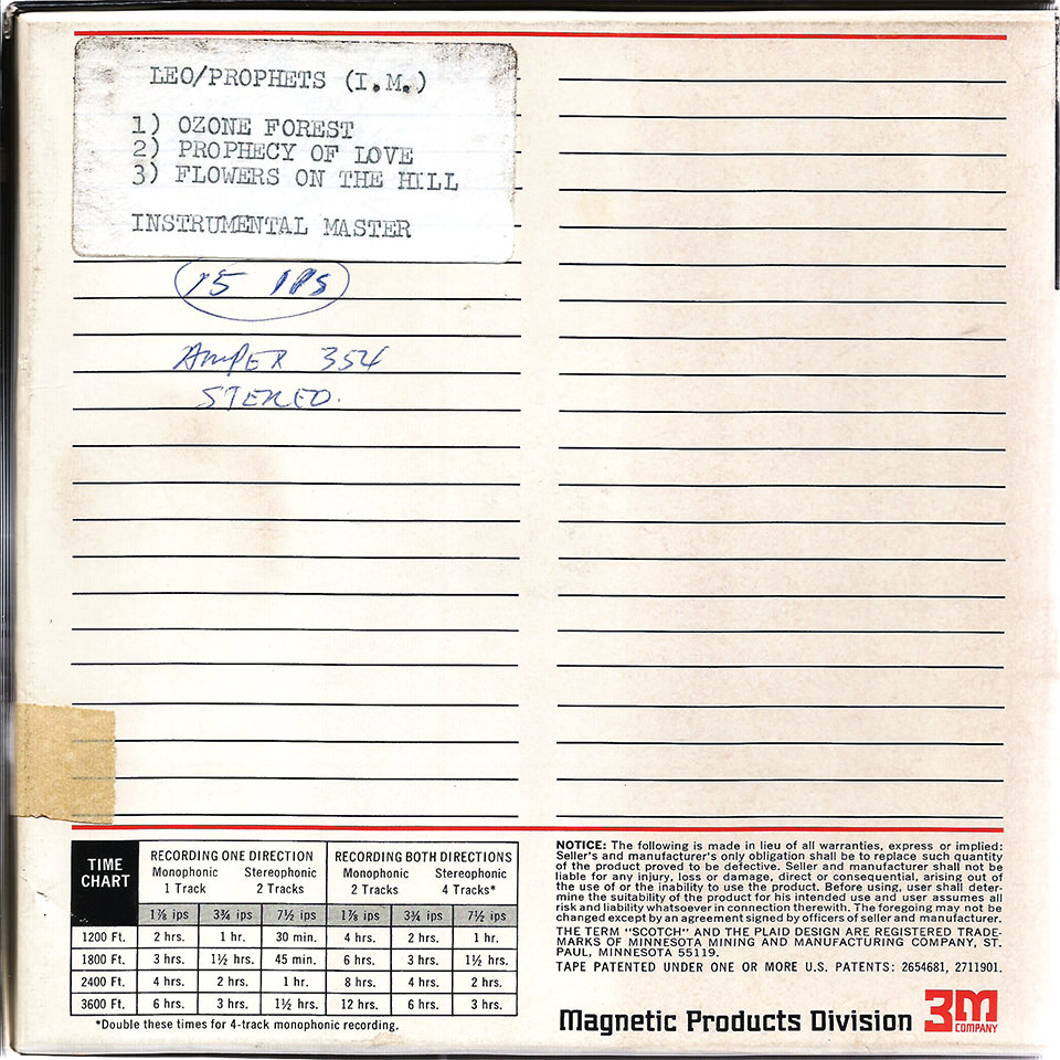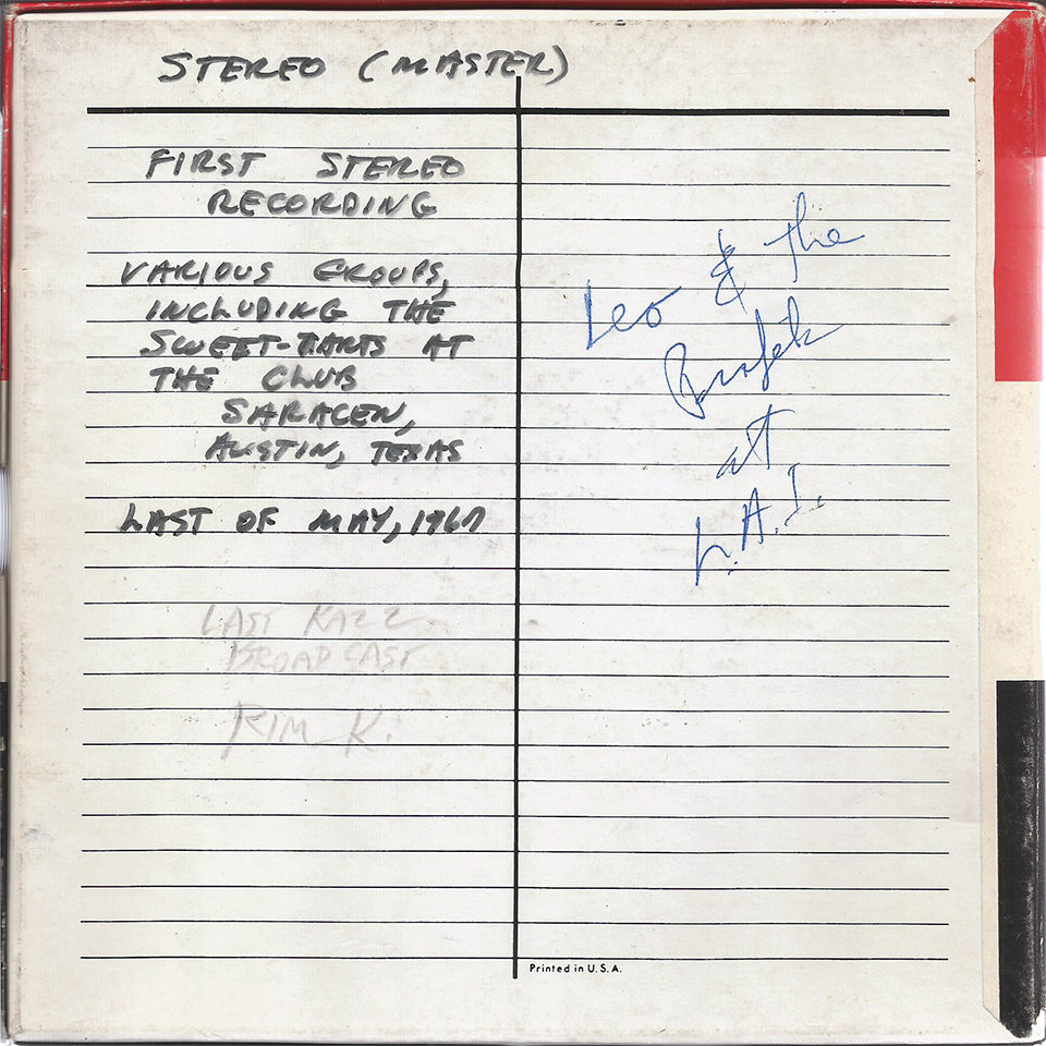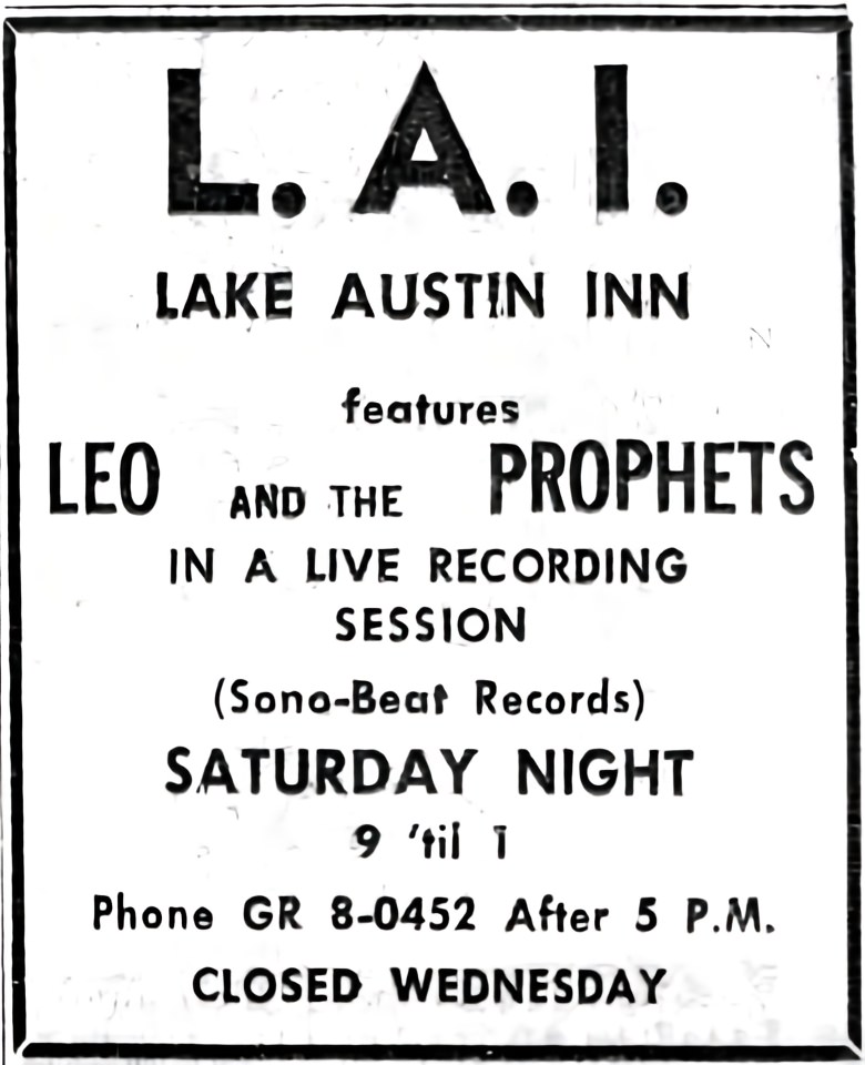 Prophets’ guitarist Dan Hickman recalled the first recording session was held at either the Ozone Forest nightclub at 34th and Guadalupe in downtown Austin, where the Prophets served as house band, or Lake Austin Inn, where the band regularly performed. Rim, who engineered the session with Bill Curtis, recalls the session was held in the parking lot of the Lake Austin Inn on a warm summer night. A scribbled note on one tape box in the Sonobeat archives indicates the session was recorded at the Lake Austin Inn. But, even more definitively, a June 30, 1967, Austin Statesman newspaper ad for Lake Austin Inn confirms the recording date as Saturday, July 1, 1967, from 9pm to 1am. The ad also indicated that the public was invited, so the session qualifies as Sonobeat’s first “live” recording. Three days after that first session, Rim hosted an Independence Day street dance at Austin’s Zilker Park for which Leo and the Prophets provided the live entertainment.