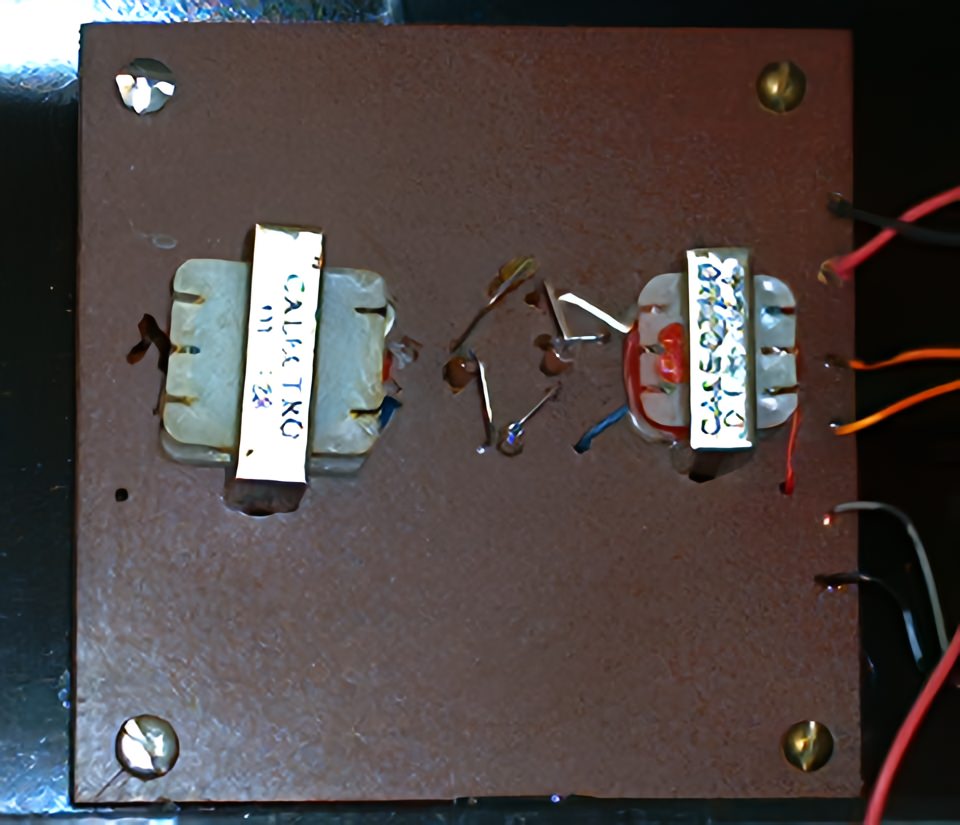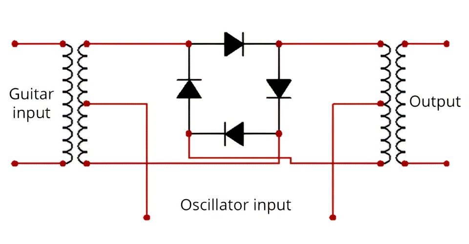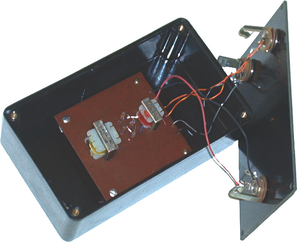 An analog ancestor of today’s digital vocoders, the Black Box accepted two inputs – usually a guitar and “something else”, often a microphone – from which it created one morphed output. Back in the 1960s, the Black Box’s sound was nothing short of sonic sorcery. For New Atlantis I’s recording of Fire, the Black Box inputs were lead guitar, tapped at its amp speaker, and a variable sine wave audio oscillatorAn audio oscillator produces frequencies – in the form of sine, square, or triangle waves – within the audio frequency range of about 16 Hz to 20 kHz. A variable audio oscillator has a rheostat that adjusts the wave’s output in realtime throughout the audio frequency spectrum. – a simple pure audio tone generator – “played” in sync with the guitar. The results ranged from low growl – created with low frequencies on the sine wave oscillator – to screaming banshee – created with higher frequencies. The Black Box was a surprisingly simple ring modulator that used just two small audio transformers and four diodes, that Rim built from a schematic he found in an issue of Popular Electronics magazine. Like most magic, it was all about misdirection, which, after all, is why it was packaged in a sealed black box...