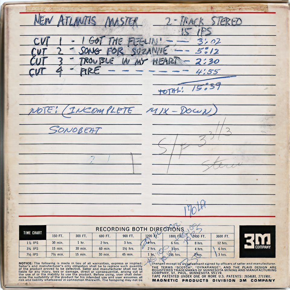 For our sound bites below, in 2018, the 50th anniversary of the initial New Atlantis recording sessions, Sonobeat Historical Archives remastered I Got the Feelin’ and remixed and remastered Song for Suzanne. When we pulled the original half-inch 4-track session masters from the archives in February 2018, we couldn’t locate I Got the Feelin’ but found clean 4-track session masters of Song for Suzanne and Fire. Surprisingly, the Sonotone Black Box effect on Fire was missing, leading us to conclude that the effect was added “live” during mix-down to the 2-track stereo master. We also present excerpts from Fire demonstrating the nuances the Black Box imparted to different sections of the recording.
