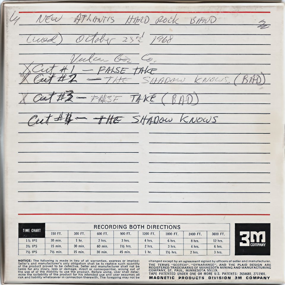 New Atlantis tracked a loose jam of its original instrumental, The Shadow Knows, during the October ’68 session at The Vulcan, setting the stage for the band’s spectacular cover of Fire, on which producer Rim Kelley used his homemade, top secret Sonotone Black Box ↓ to anthropomorphize Jim Ming’s scorching lead guitar. Rim wanted to release a single with New Atlantis’ original I Got the Feelin’ as the “A” side and Fire as the “B” side, so Bill Sr. circulated the tape to his major label contacts seeking a national release; although the Sonobeat archives shed no further light on the outcome, it’s clear that there were no takers. What’s not clear is why Sonobeat didn’t release the single on its own label.