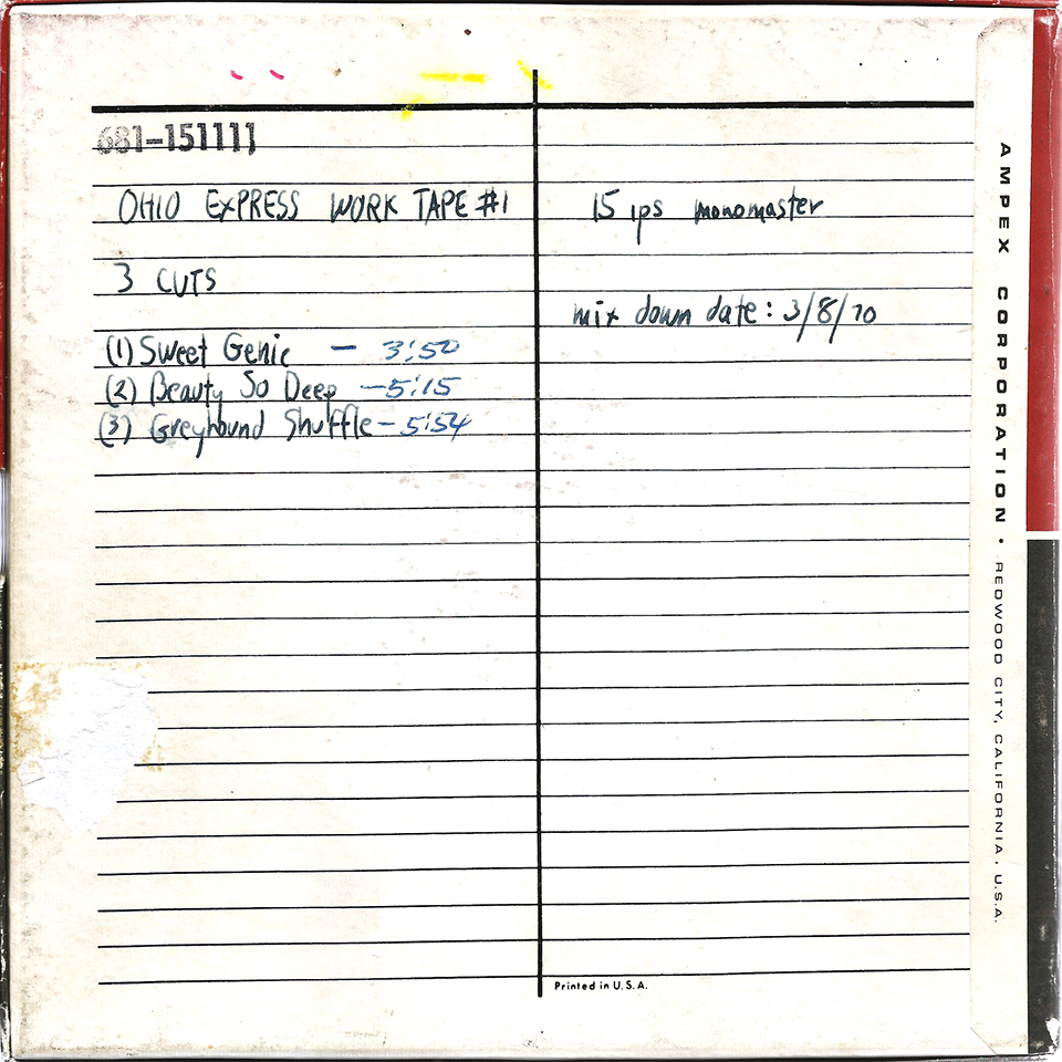 Entering 1970, Sonobeat co-founders Bill Josey Sr. and Rim Kelley“Rim Kelley” was the pseudonym used by Sonobeat co-founder Bill Josey Jr. as a radio deejay in Austin, Texas, during the 1960s and as a Sonobeat producer from 1967 to 1970. seemed to bump into The Ohio Express all around Austin, including at downtown Austin’s hippie music hall, The Vulcan Gas CompanyThe Vulcan was Austin’s first successful hippie music hall, opening in 1967 in an old warehouse at 316 Congress Avenue and closing in 1970. Its better known successor was Armadillo World Headquarters.. Eventually the Joseys introduced themselves to members of the band. Hoping to produce a hit single with the nationally-established and well-known Ohio Express, Bill Sr. offered to record the band, and Grassel agreed. According to Rim, the resulting sessions, which he produced with Bill Sr. and engineered, had a weird, magical vibe, yielding three original songs: Sweet Genie, Beauty So Deep, and Greyhound Shuffle, all written by Grassel. Although both had long running times, Sweet Genie (3:50) and Beauty So Deep (5:15) were strong candidates for a Sonobeat stereo 45 RPM single release, but it turned out Super K and Buddah owned the names “The Ohio Express” and ”Ohio Express” (“The” was dropped from the band’s recording name with the release of the single Mercy in 1969, but not from the touring groups’ name), so Sonobeat put its tentative release plans on hold while Grassel discussed the situation with Super K and Buddah execs.