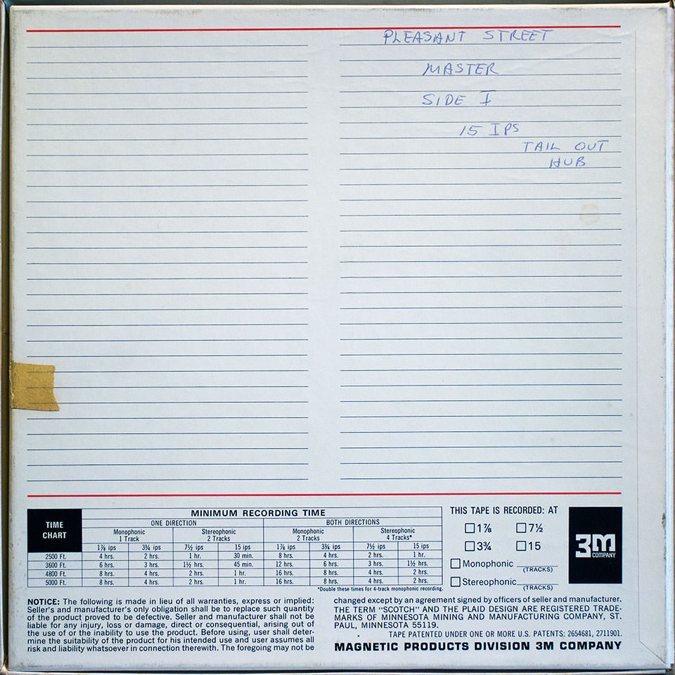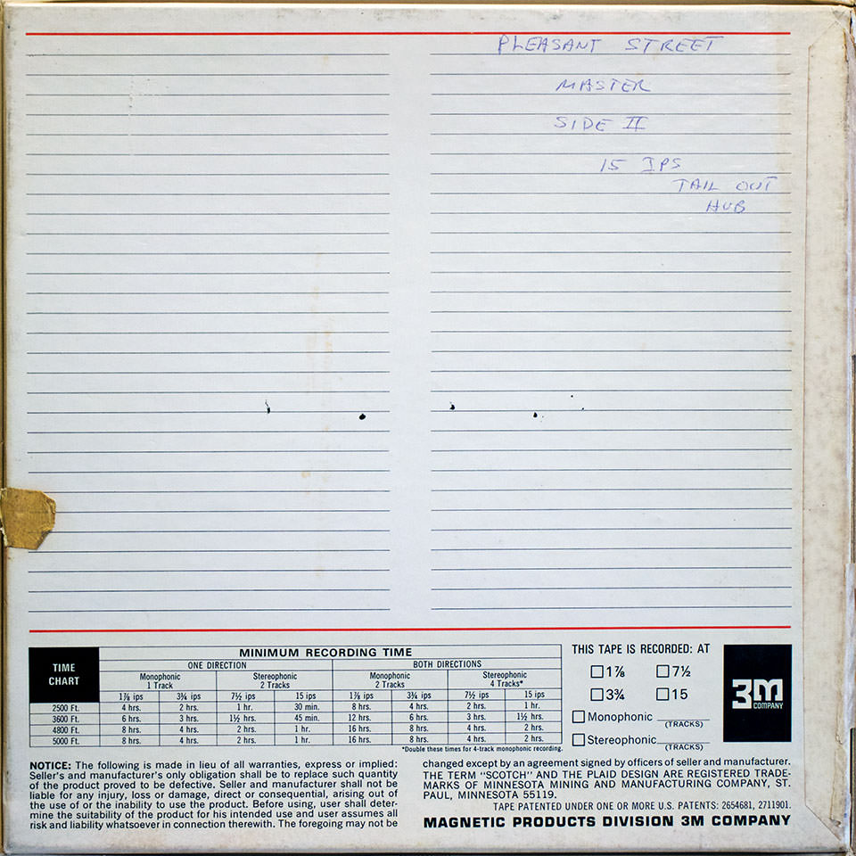 For decades we held a mysterious, unlabelled 33-1/3 RPM LP test pressing in the Sonobeat Records archives. The markings in the dead wax didn’t help us identify the band. The tracks on the test pressing were a little folksy, a little bluesy, with tinges of gospel here and there, and featured vocals that sounded familiar to us, but we just could’t place who the recording was by. Then, in 2008, as we were re-indexing the Sonobeat master tape library, we came upon two 10.5" tape reel boxes marked “Pleasant Street”. On a hunch we compared the ten songs on the test pressing to the ten songs on the Pleasant Street master tapes and, voilà, they were the same! Suddenly we realized the band’s lead vocalist was Bill Wilson, a virtuoso folk-blues singer-songwriter who we had recorded a few years earlier to showcase his original songs and in 1970 as a guest singer on Sonobeat’s Mariani hard rock demo album. Two more voilàs!