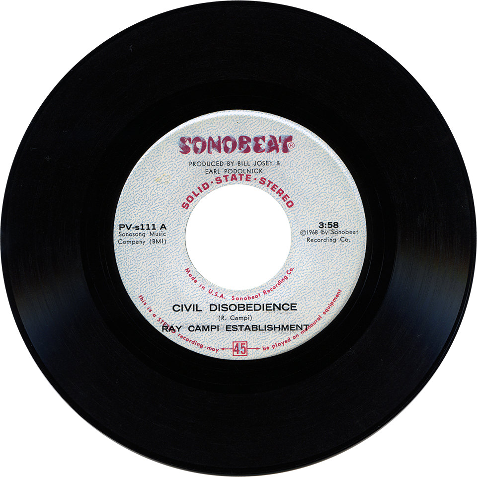 Ray Campi’s Civil Disobedience backed with He’s a Devil (In His Own Home Town) gave Sonobeat its first and only novelty 45 RPM single. Recorded and released in 1968 and credited to “Ray Campi Establishment”, Civil Disobedience was Ray’s own take on the same general subject addressed by Country Joe and the Fish in their 1965 single, I-Feel-Like-I’m-Fixin’-To-Die: hippie sit-ins, protests, and riots in reaction to the unpopular Vietnam conflict. The “B” side, He’s a Devil, is a classic Irving Berlin-Grant Clark tune, written in 1914, performed by Ray in a 1930s style reminiscent of The New Vaudeville Band’s 1966 hit, Winchester Cathedral. But Ray’s rockabilly sensibilities distinguished his performances, so that neither Civil Disobedience nor He’s a Devil sounded derivative. Ray gave both songs a fresh take on vintage styles.