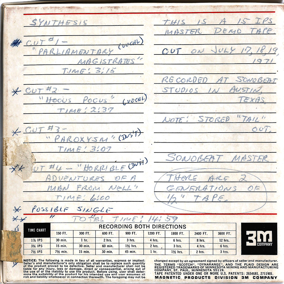 Synthesis was the second group Bill recorded at his then-newly relocated Sonobeat Studios, housed in the KVET Building on North Lamar in Austin. The four songs the trio recorded, all originals, included vocals Parliamentary Magistrates and Hocus Pocus and instrumentals Paroxysm and Horrible Adventures of a Man From Nell (that’s right, “Nell”, not “Hell”). Bill recorded the basic instrumental beds onto four tracks on Sonobeat’s Scully 280 half-inch machine, which he then mixed down to two tracks on Sonobeat’s second half-inch machine, a Stemco 500-4. This left two available tracks for overdubs, and the resulting 4-track master was then mixed down to the final stereo master on an Ampex AG-350 quarter-inch 2-track deck.