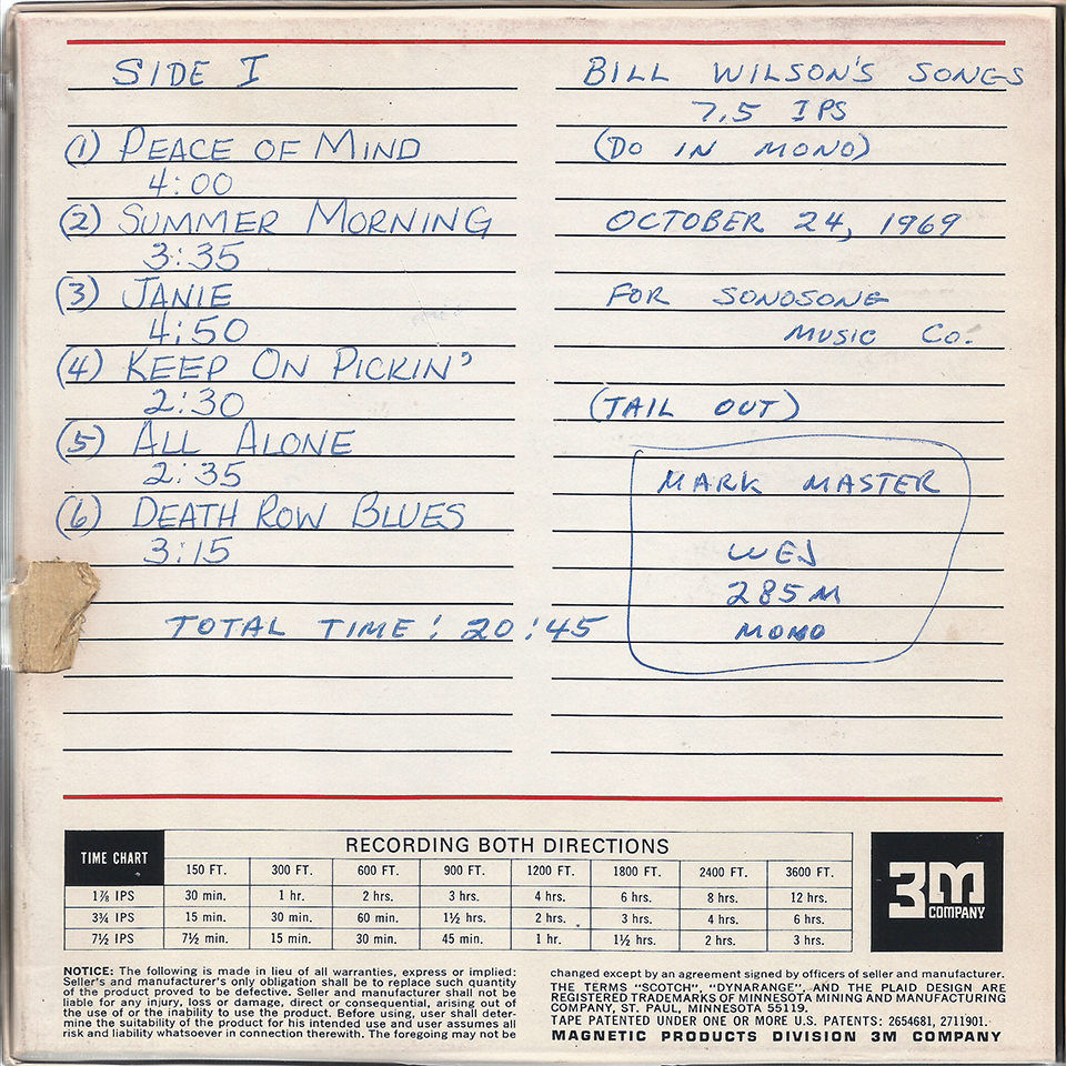 Bill’s first work with Sonobeat began in October 1969 with sessions that led to a non-commercial song demo album for Sonobeat’s music publishing subsidiary, Sonosong. The album, Songs from the Catalog of Sonosong Music Company: Bill Wilson, Composer, featured eleven of Bill’s original compositions spanning blues, country, folk, and pop genres. In August 2020, a copy of the demo – not more than 105 copies were manufactured – sold on eBay for $300, demonstrating that Bill’s music has remained in high demand over the decades as well as indicating how rare it is for copies to be in circulation (given that there appear to have been no other copies publicly available since 2020).