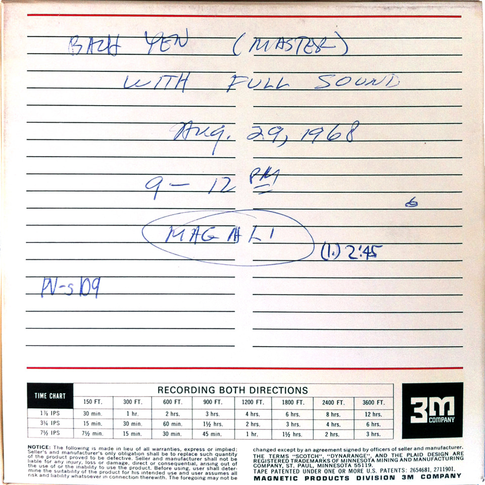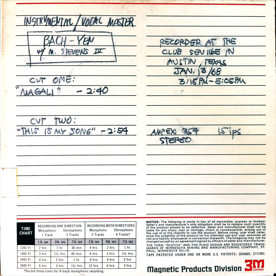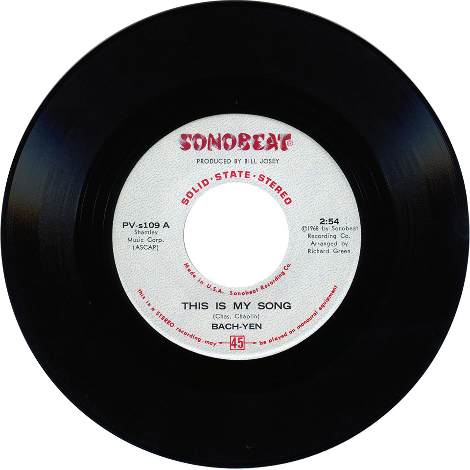 To complete Bach-Yen’s Sonobeat release, producer Bill Josey Sr. called in orchestral arranger Richard Green (who had provided the string arrangement on Sonobeat’s first single by Lavender Hill Express). Richard layered strings and horns, performed by members of the Austin Symphony Orchestra, over the original tracks, which already included Bach-Yen’s vocals, so he had to embellish and punctuate the tracks while minding the wide dynamic range of Bach’s vocals, which varied from sotto voce to fortissimo. There was no calling Bach-Yen back for a vocal overdub re-do, as she was already booked solid into nightclubs across the U.S. but had no return engagements booked in Austin. Bach’s Sonobeat single was completed on August 29, 1968, and released a little over two months later.