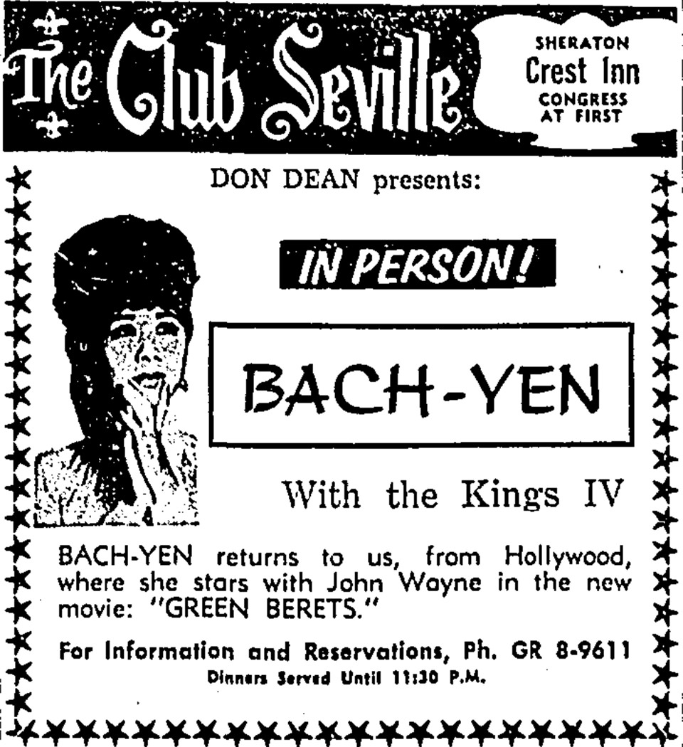 [Lt. Glenn] Craig and I had great respect and sympathy for the people of South Vietnam and their cause, and we thought they deserved all the support the United States could give them. It seemed to us that if the Americans at home could get to know the Vietnamese people a little better, American support would be more solid. We considered a number of Vietnamese singers and then, early in 1964, we read about Bach Yen, who had just returned from France and was opening a singing engagement at one of Saigon’s big clubs, the Dai Kim Do.”