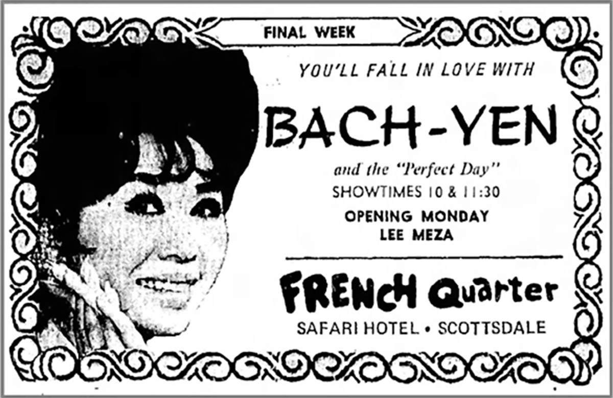 In 1965, Bach-Yen trekked to the United States specifically for a single performance on America’s favorite Sunday night TV variety program, The Ed Sullivan Show. Bach’s trip to America was the brainchild of two Navy lieutenants stationed in Saigon during the Vietnam conflict. A months-long search led the officers to Bach-Yen, but it took a lot of convincing to get her to agree to make the trip to the U.S. and still more convincing to get backers to finance the trip. Finally, Bob Precht, a producer of The Ed Sullivan Show, agreed to pay to bring Bach-Yen to New York to appear on the program. Bach’s performance on Sullivan’s show, then the top-rated TV variety program in America, was sensational, and she was immediately booked into guest slots on other TV variety shows, including The Bob Hope Show, The Joey Bishop Show, and Shindig. Bach’s two-week U.S. visit turned into a non-stop 12-year tour of 46 states, Canada, Mexico, and South America.