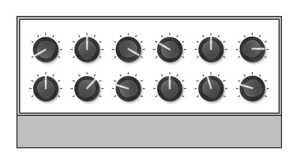 Bill Curtis’ approach to assembling each input circuit was as simple as the circuits themselves: he just twisted the appropriate transistor, capacitor, and resistor leads together and added a drop of solder to each twist, creating a small open-air ball of components for style="margin-bottom: -2px;">Bill Sr. built a small wooden box – about eight inches high, six to seven inches deep, and 16 inches wide – to house the circuits and dressed it with a brushed aluminum faceplate into which he drilled two rows of six holes each to mount the volume and stereo pan controls. He mounted XLR microphone connectors and quarter-inch line input and output phone jacks on the back of the box. Curtis then soldered his preamp circuits into place, leaving the balls of transistors, capacitors, and resistors dangling inside the box. He was careful to separate the components so they didn’t short out. To make it easy for Curtis to tweak the circuits as needed, Bill Sr. left the bottom of the box open. Although we little mixer was long ago abandoned for a more sophisticated mixer, we haven’t found photos of it nor Bill Curtis’ schematic drawings in the Sonobeat archives; however, Rim recalls it was modeled on and looked similar to the KAZZ-FM production room mixer. In 2016, Rim recreated a set of elevation drawings from memory.