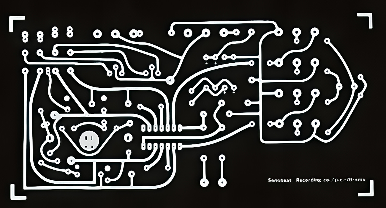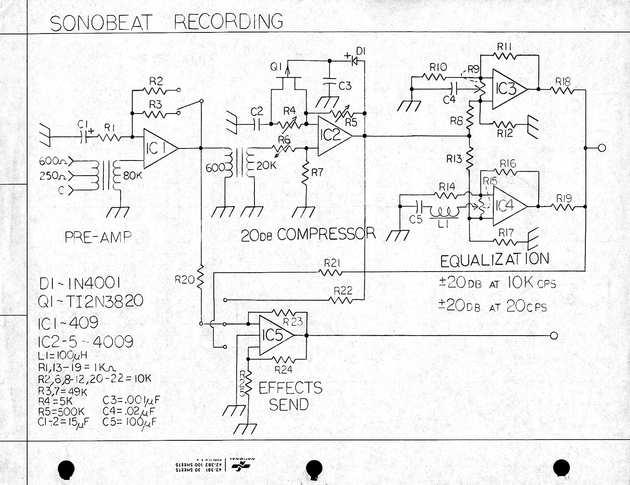 In late summer 1968, Sonobeat acquired a high-end Scully half-inch 4-track recorder, which gave the Joseys the ability to undertake more elaborate, layered recordings. Although the 10-input suitcase mixer was serviceable throughout 1968 and into 1969, it eventually couldn’t handle ever more complex recording sessions. As 1969 came to a close, Rim began researching a modular approach to combining audio circuits that could provide an array of functions – including compression, equalization, and reverb – separately for each microphone and line-level input channel. He turned to db: The Sound Engineering Magazine, which featured scholarly articles on recording console circuitry, but he also bought a book filled with audio circuit designs that he found in the Electrical Engineering section of The University of Texas bookstore. Armed with an array of potential circuits, in January 1970, he began laying out circuit designs for each input channel and eventually created larger and more sophisticated printed circuit boards using the same process he had used for the printed circuit boards in the 10-input suitcase mixer.